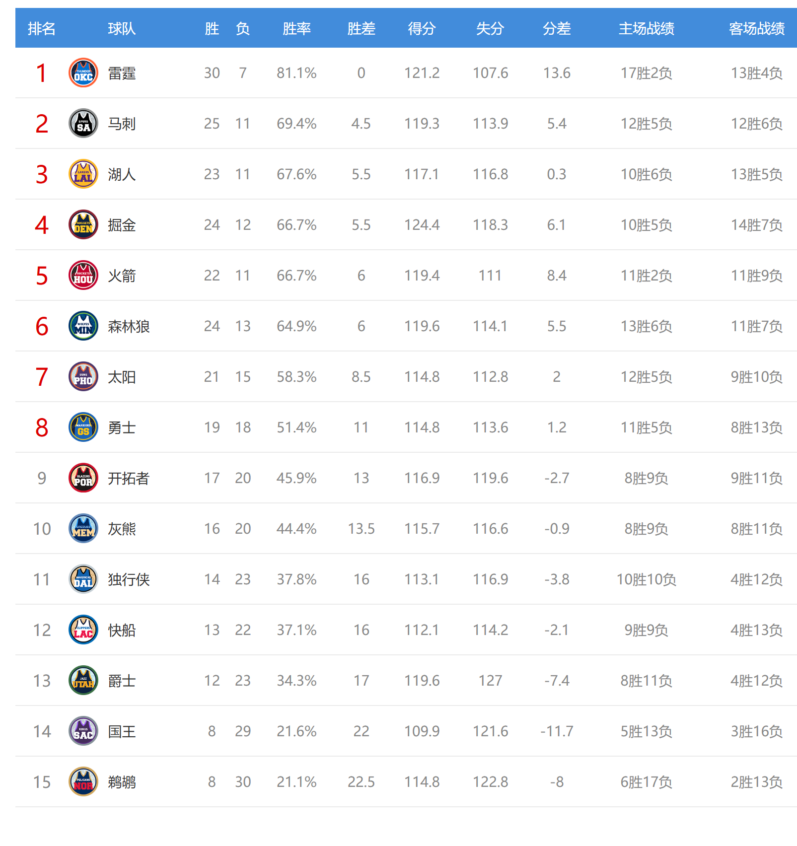 今日比赛后快船、独行侠排名互换,其他西部球队排名不变。